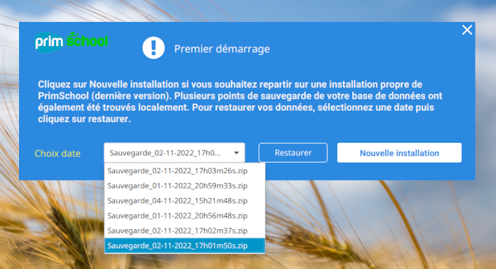 Démarrez PrimSchool en double cliquant sur l’icône. La fenêtre ci-dessous apparaît. A ce stade, l’application vous propose deux choix : soit vous choisissez « Nouvelle installation », soit « Restaurer ». C’est ce deuxième choix qui vous permettra de récupérer vos données. Choisissez ensuite la date la plus récente depuis le menu déroulant puis cliquez sur « Restaurer ».